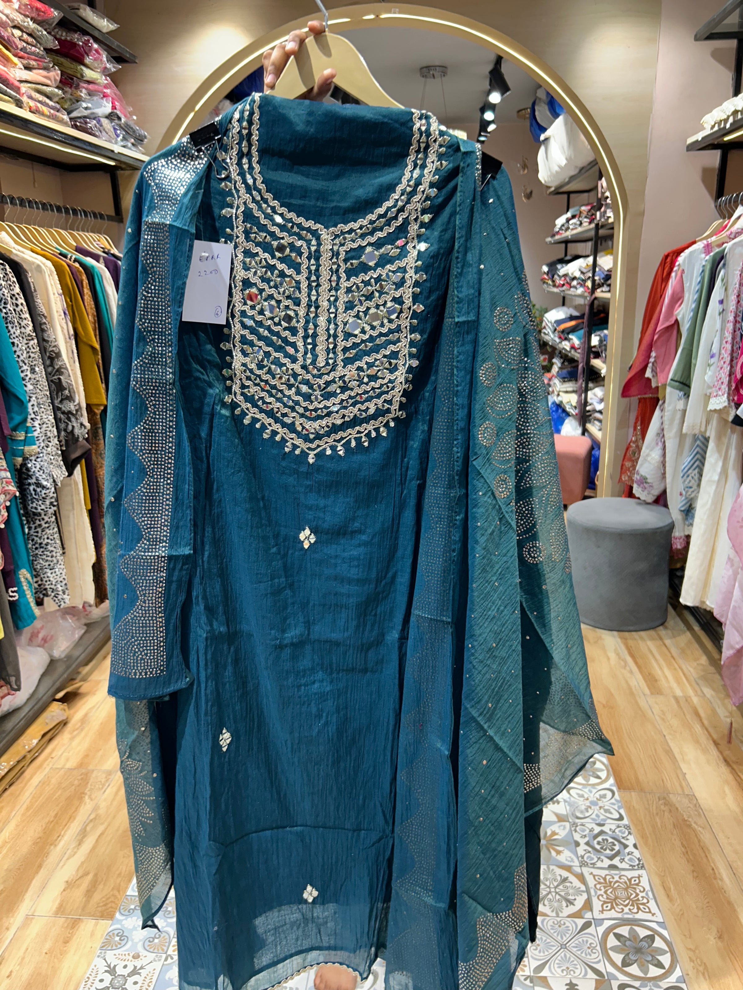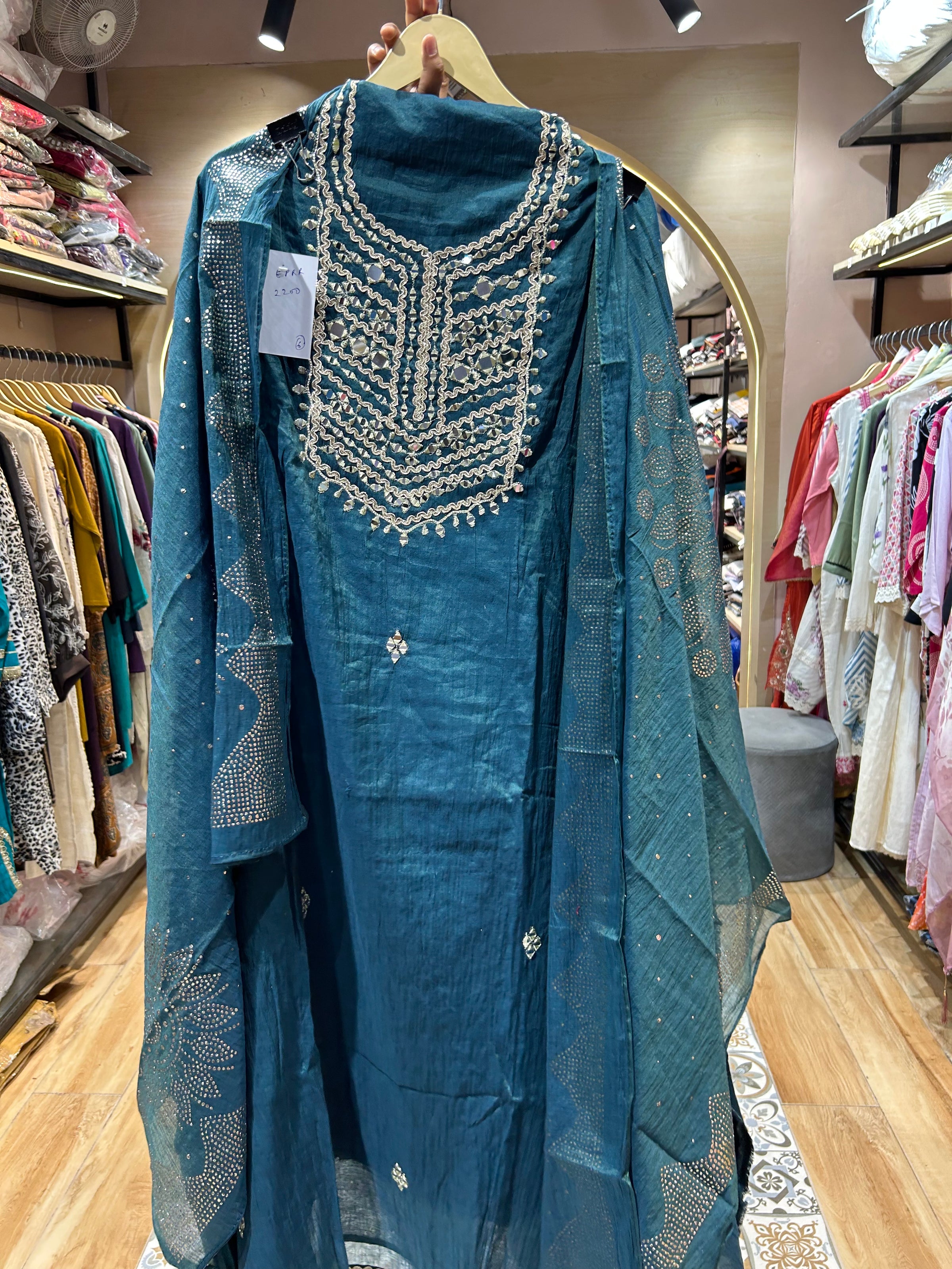 Give your Everyday look a dreamy update with this beautiful fabric. Team these with heels or flats and shoulder bag for a look we're loving. Handwork on kurta and dupatta