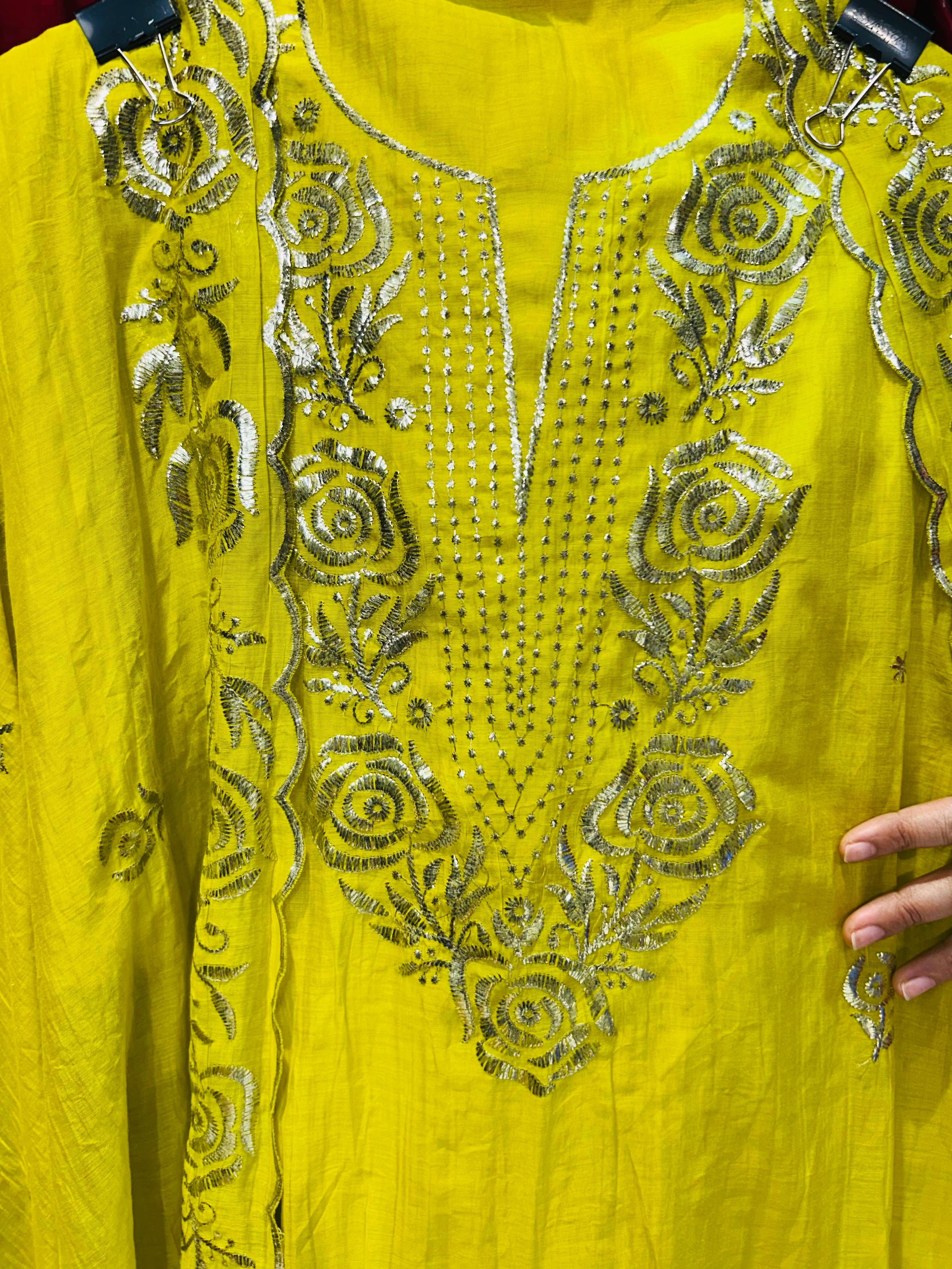 EMBROIDERY:- Intricate dense mukesh hand work on all over shirt fabric is cotton chanderi , created a delicate raised texture.