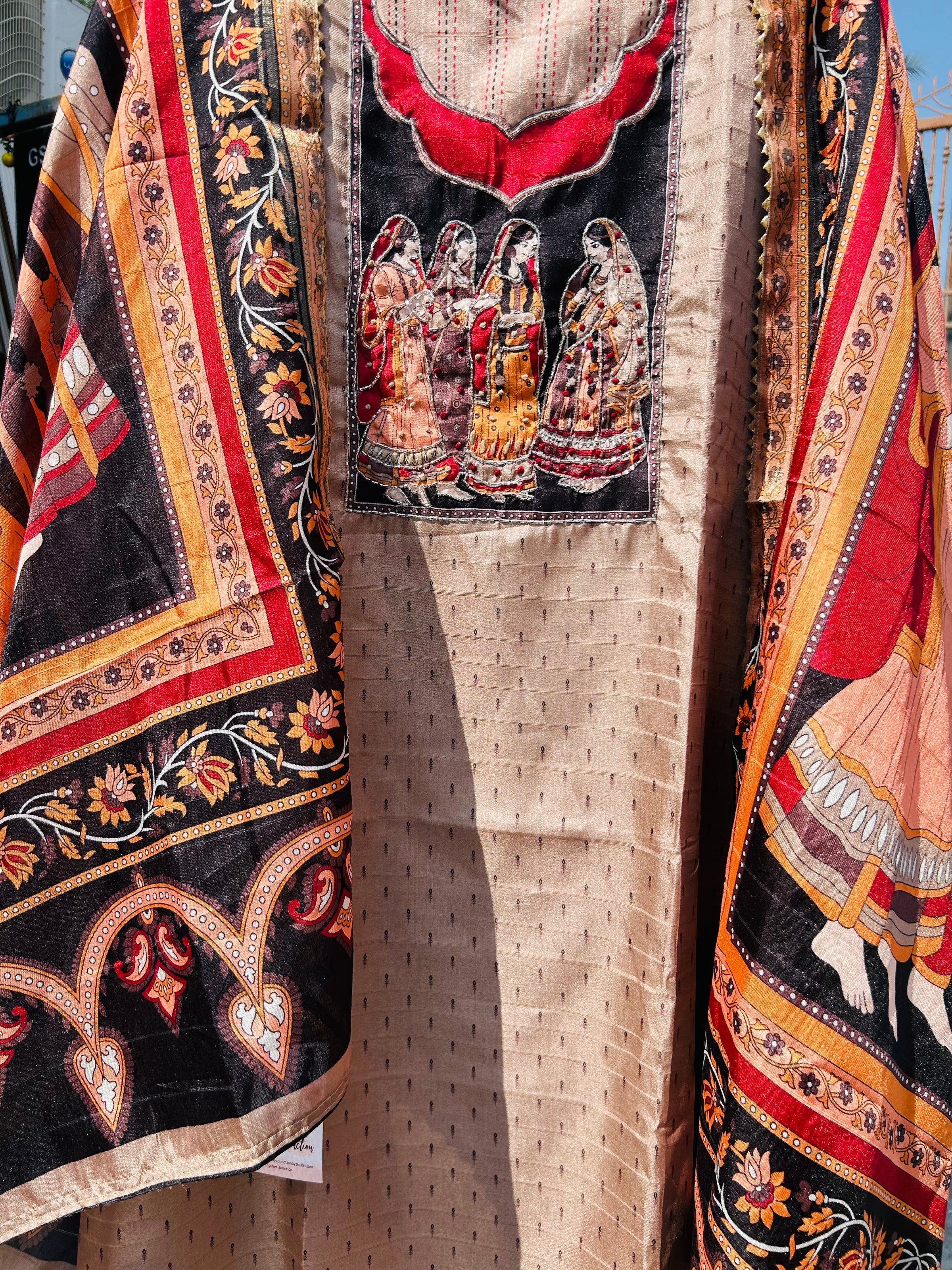 EMBROIDERY:- Intricate neck printed digital work with dense hand work on neck and all over shirt fabric is chanderi silk  , created a delicate raised texture.