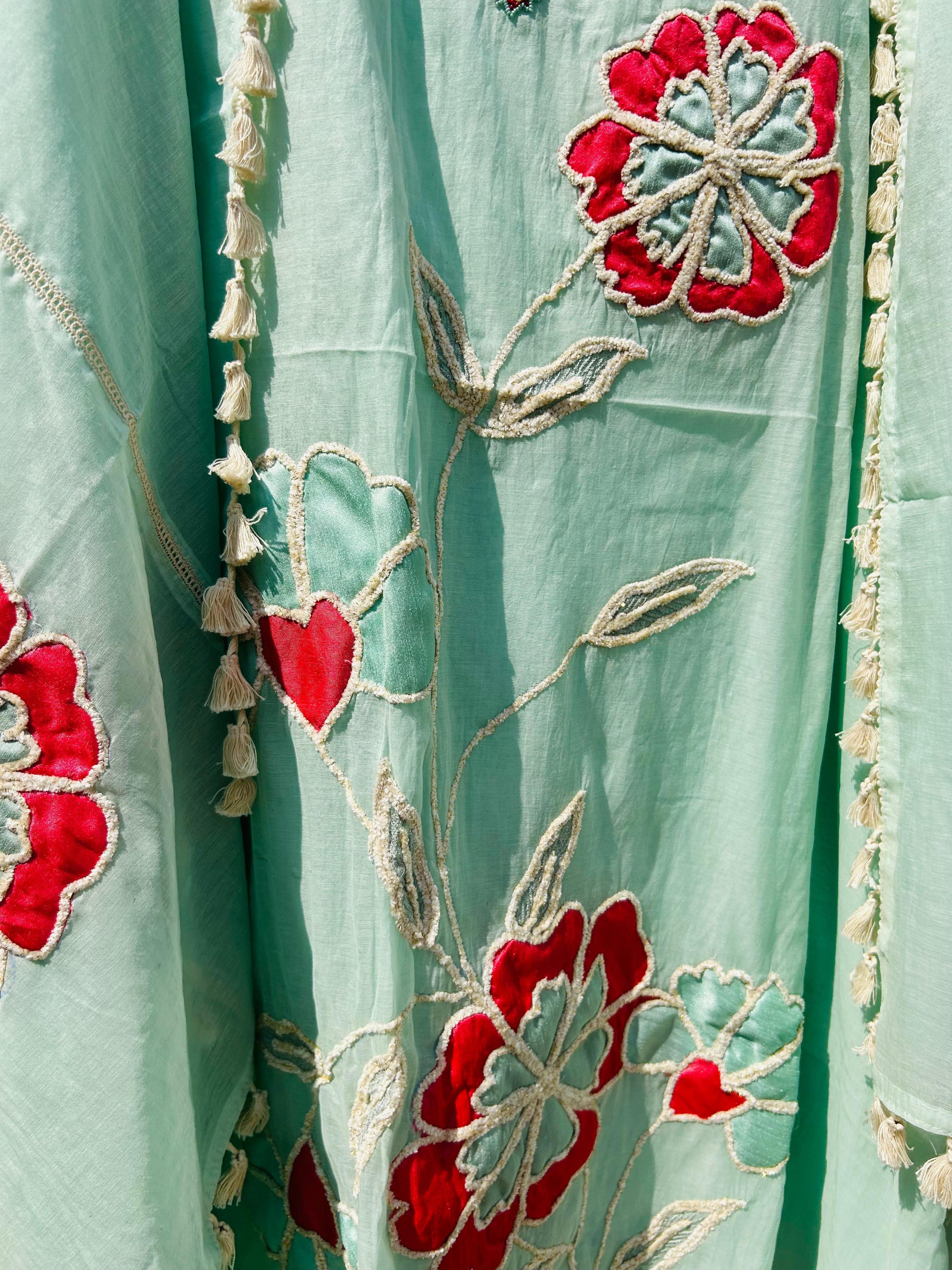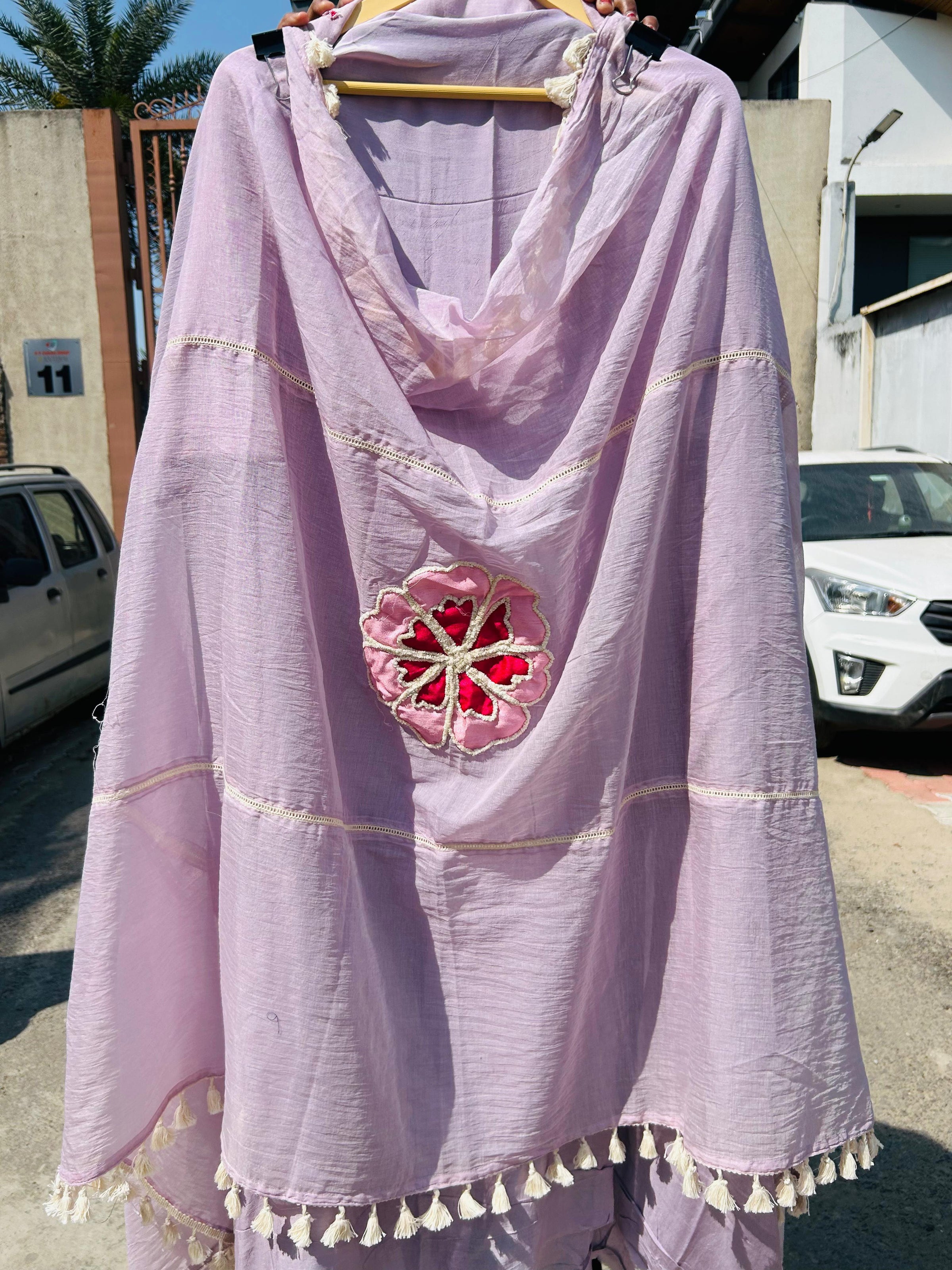 paired up with a chanderi cotton side tassels lace and multi color patchwork with embroidery on duppata with neat finishing enchancing the luxe appeal