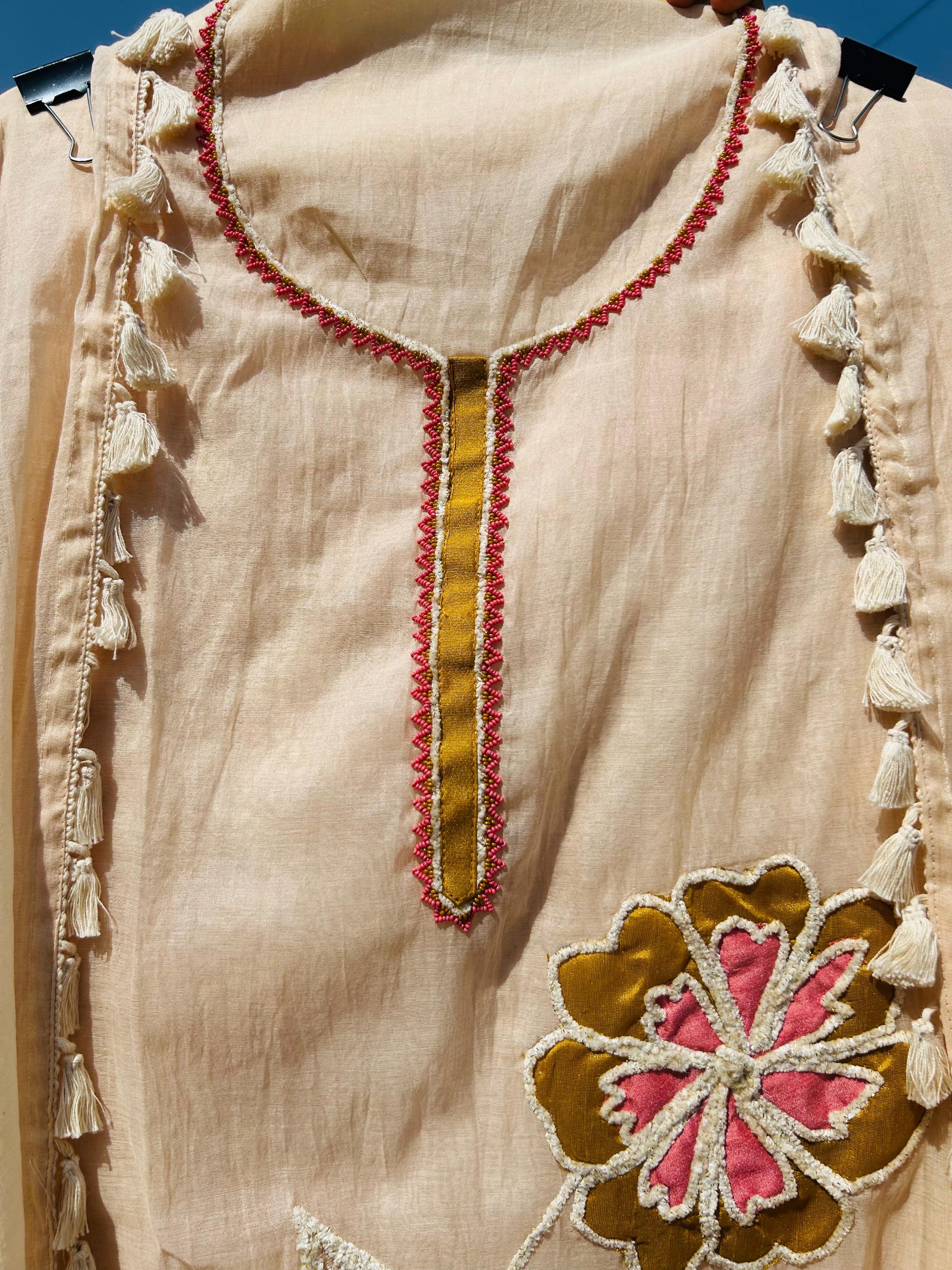 EMBROIDERY:- Intricate  dense hand work neck and on all over shirt fabric is cotton chanderi , created a delicate raised texture.