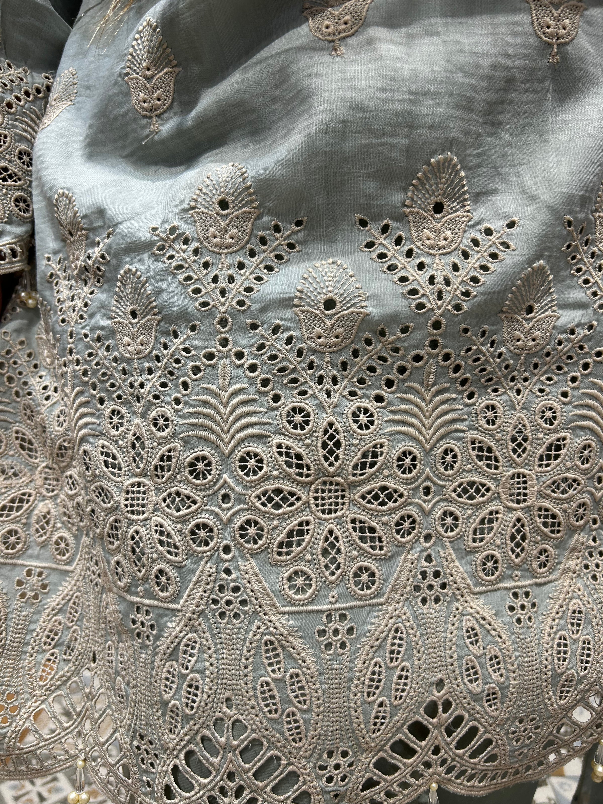 Neckline Design:- chinese collar neck style neckline , highlighted using ghera on cutwork detailing