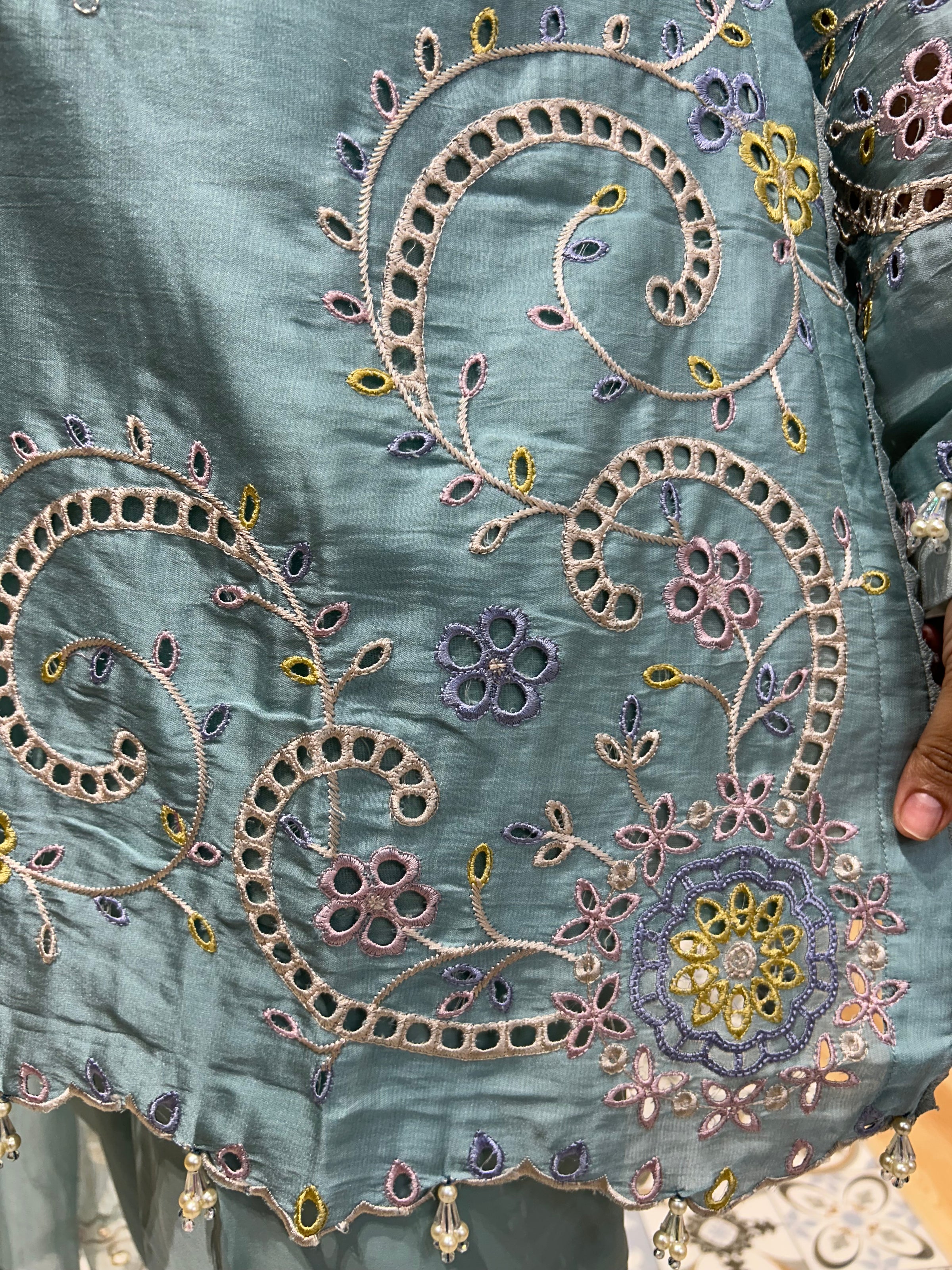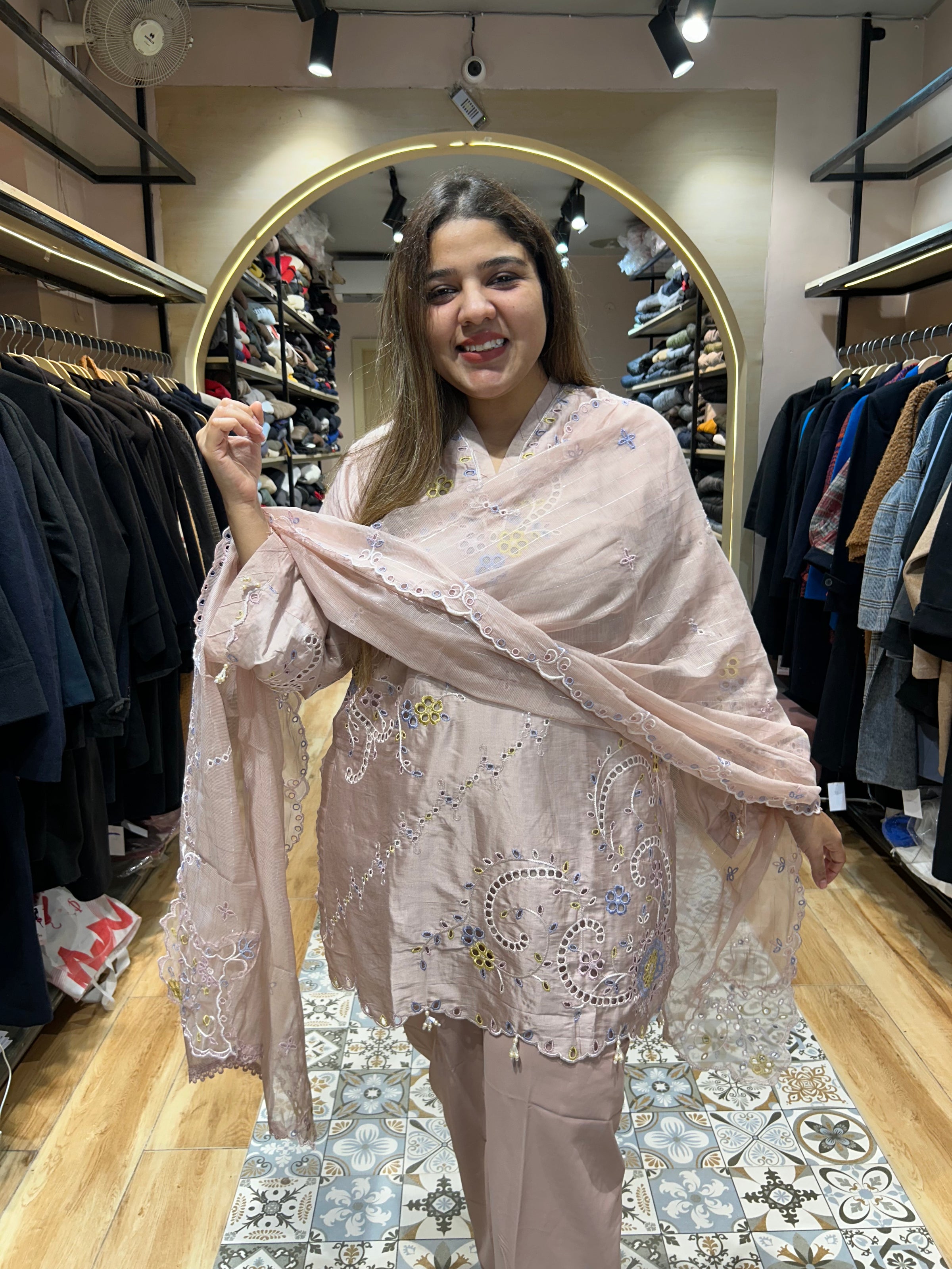 paired up with a duppata finely embroidered, scalloped edges and neat finishing enchancing the luxe appeal