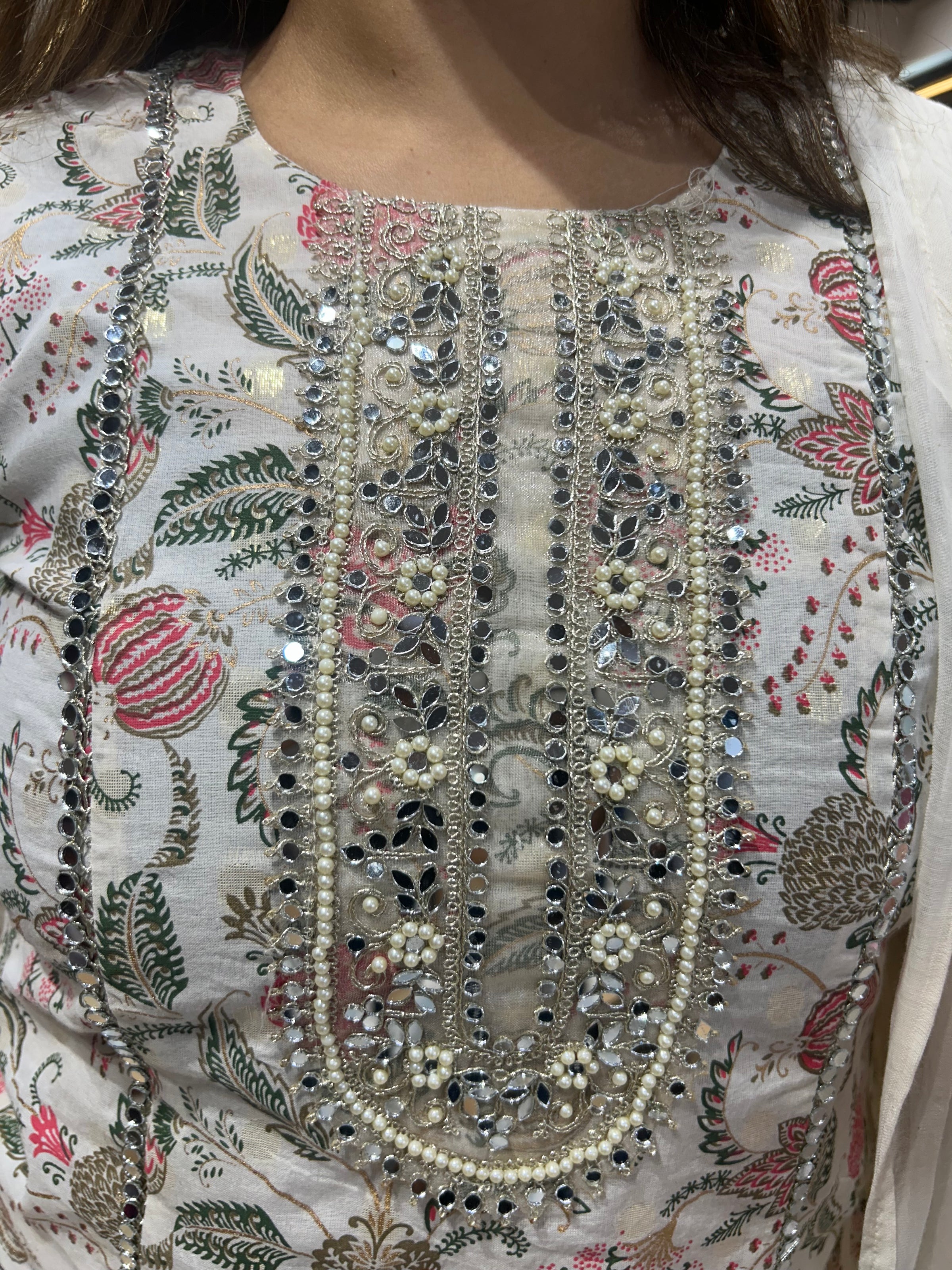 Neckline Design:- round neck style neckline with mirror work, highlighted using fine pearl work detailing