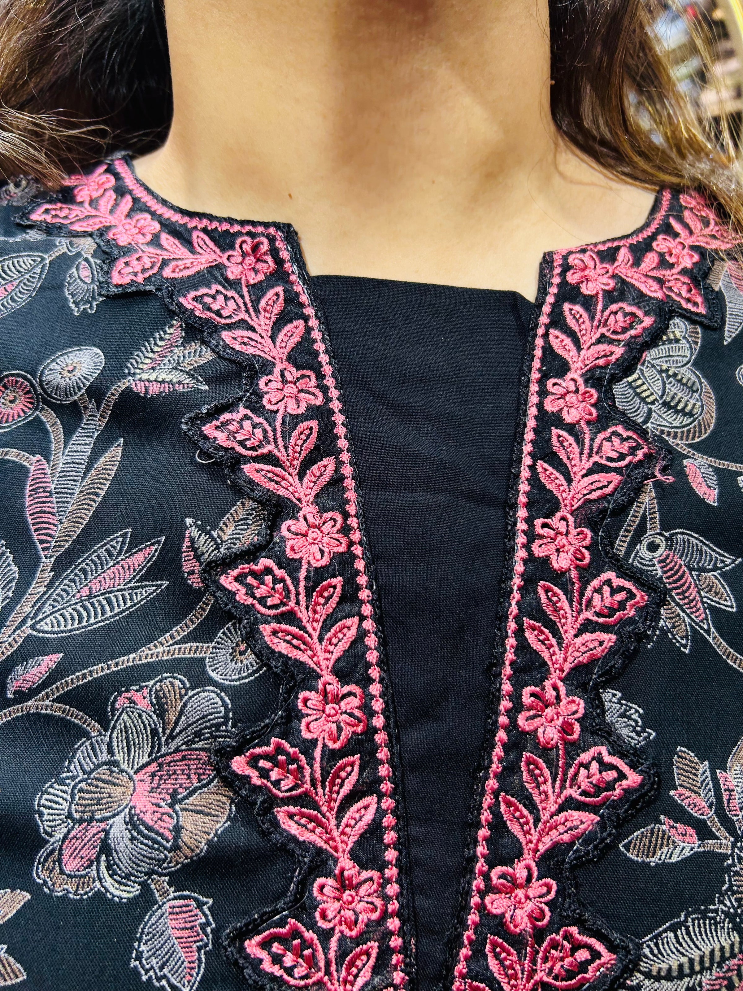 Neckline Design:- round neck style neckline with cutwork lace and patchwork, highlighted using ghera on cutwork lace detailing