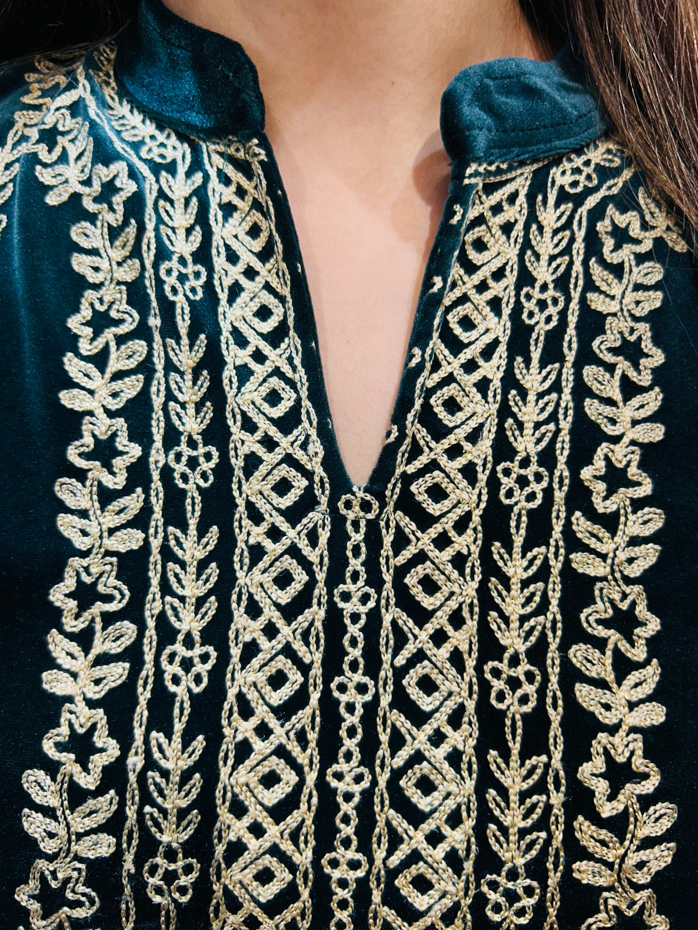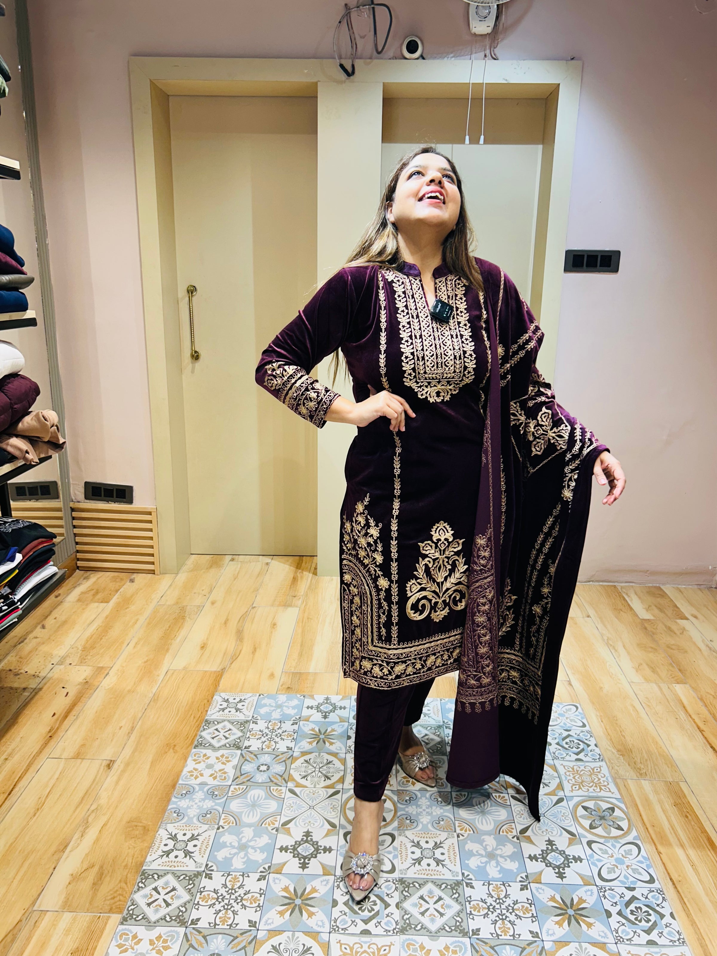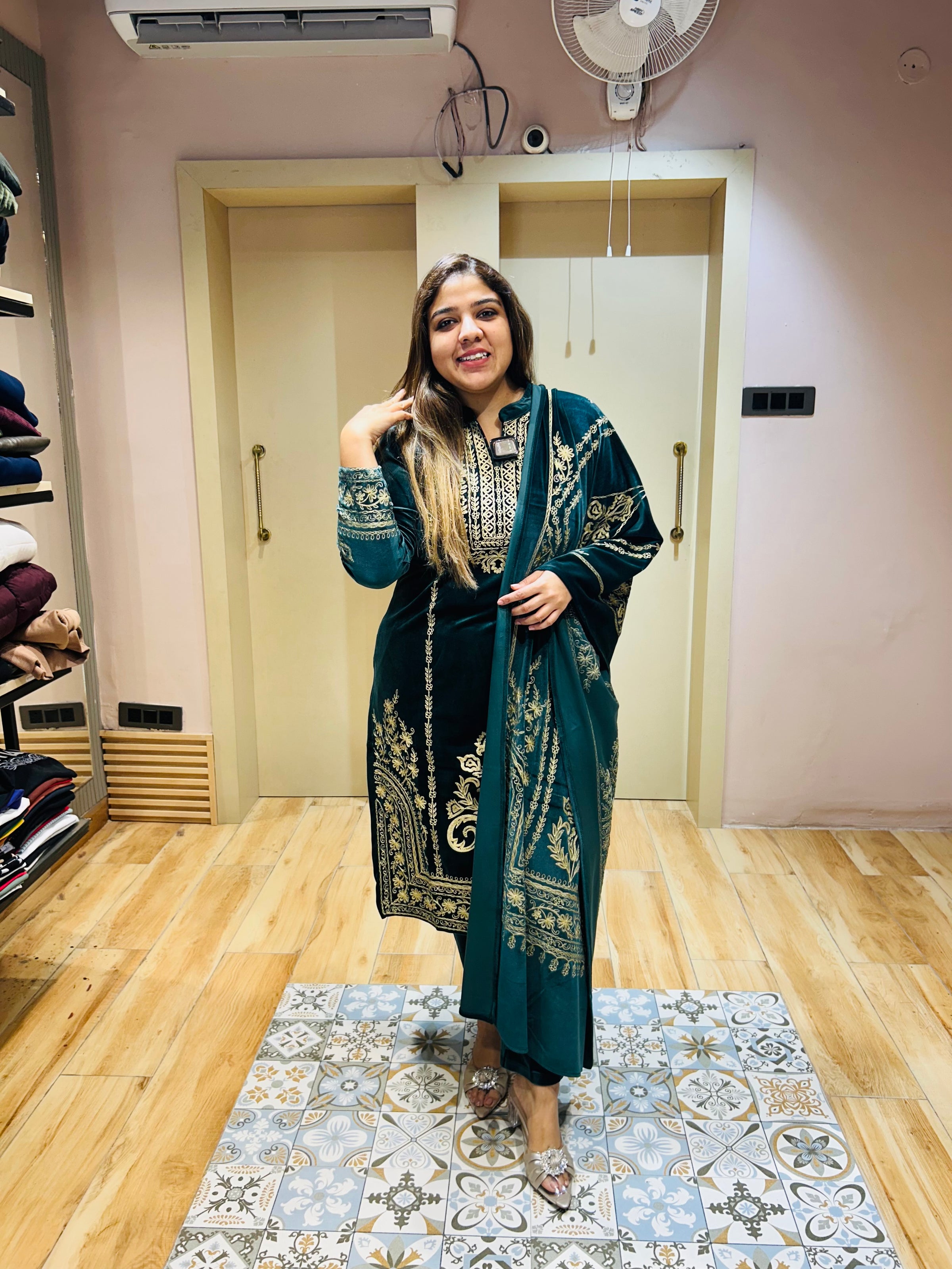 Beautiful unique design of suit with detailing all over neckline and bottoms. The detailing and pattern will make a lit of heads on you and will also give you comfortable and classy look.