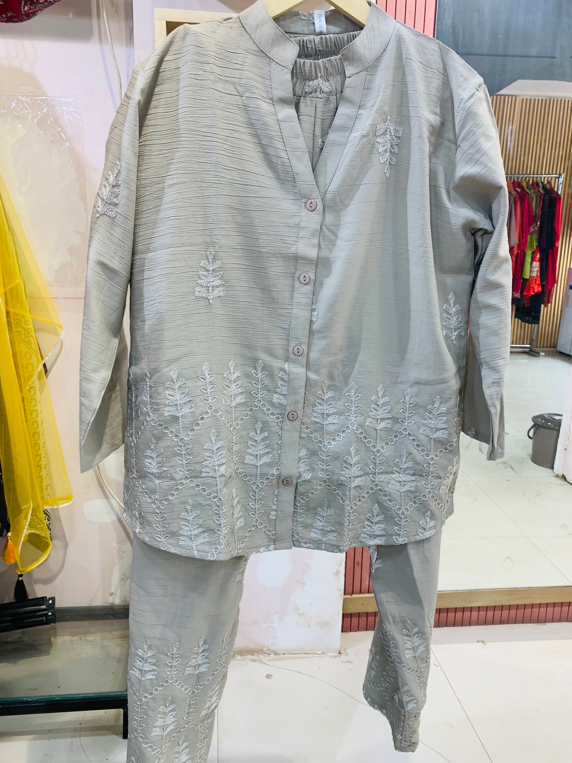 Beautiful unique design of coordset with detailing all over neckline . The detailing and pattern will make a lit of heads on you and will also give you comfortable and classy look.